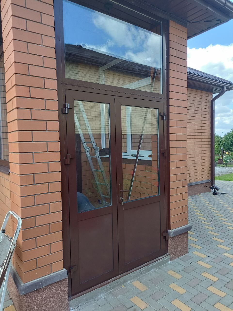 - цвет профиля подобран по каталогу RAL (оттенок 8017 — тёмно-коричневый), гармонично сочетающийся с кирпичной кладкой фасада;
